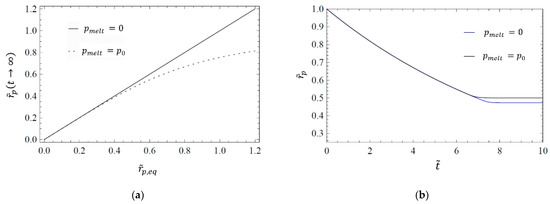 Comparison of the equilibrium radius (at ) as a function of the equilibrium value of the pore diameter (a) and the pore collapse dynamics (b), with and without consideration of the hydrodynamic ambient pressure acting on the surrounding melt . The parameters for both plots are and .