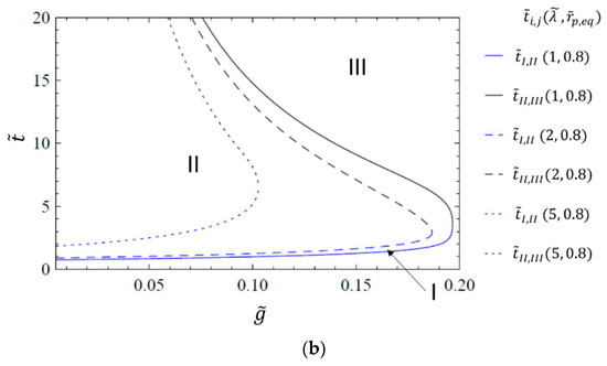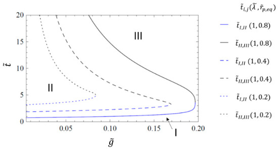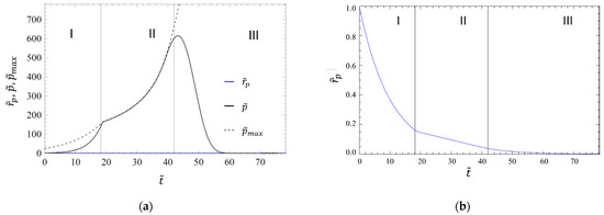 A plot of a solution of Equations (17) and (18) for the dimensionless gas pressure and the radius is shown in Figure 5a,b. The axis for is rescaled in Figure 5b. The plot in Figure 5a includes a dotted line for the limiting (maximum) gas pressure , above which the pore will expand due to the inner gas pressure. This maximum pressure is the pressure at which the local force exerted by pressure and surface tension cancel. It can be calculated to be . Three distinct regimes are recognizable, which are separated by vertical lines in Figure 5. The regimes are denoted from left to right as regimes I, II and III. In regimes I and III, the surface tension is considerably larger than the gas pressure, and even in the absence of diffusion, the pore would shrink. These regimes are surface-tension-driven regimes. In regime II, surface tension and gas pressure are of almost equal magnitude. In the absence of gas diffusion in the surrounding polymer melt, the pore collapse dynamics would thus slow down and stop. Therefore, regime II is called the diffusion-controlled regime. The exact transition times between the regimes are to some extent arbitrary. In this work, the condition is used to distinguish the two surface-tension-driven regimes (I and III) and the diffusion-controlled regime (II).