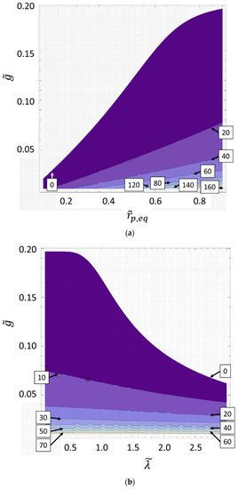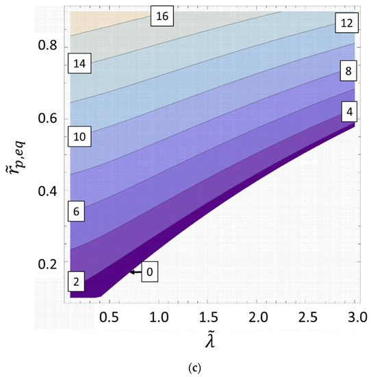 The time difference between both dimensionless transition times (Δ), which is the time duration of the diffusion-controlled regime II, can be plotted as a two-dimensional contour plot by selecting two of the three parameters and , (such as , or ) as variables. This permits study of the interdependence of the parameters in a compact way, as shown in Figure 8a–c.