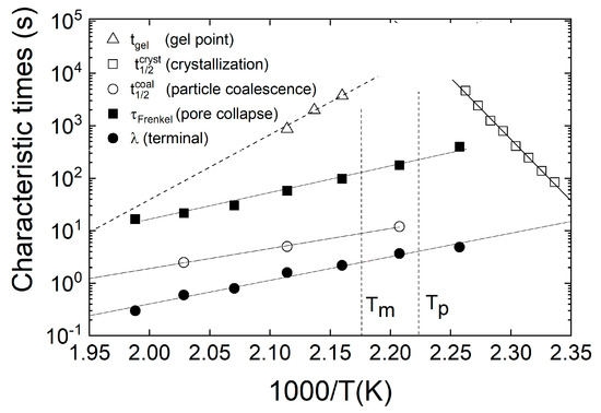 The characteristic times in Figure 9 are the Frenkel time for a pore to disappear by neglecting the gas pressure in the pore [4], the half-time () for the coalescence of two individual particles from [4], the terminal relaxation time ) of the viscoelastic spectrum of the melt [6], the half-time of crystallization [6] and a characteristic gelation time due to chain lengthening, branching and/or cross-linking by thermal aging . for particle coalescence are estimated from the time dependence of the neck radius between particles from [4]. Chain lengthening in PA12 is due to a post-condensation reaction (see [6,20] and references therein).