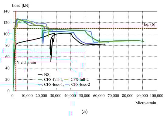 | CFS-full-1 | 125 kN | (1) Yielding in gross sectional area; (2) debonding of CFRP; (3) yielding at breakage in net area. |