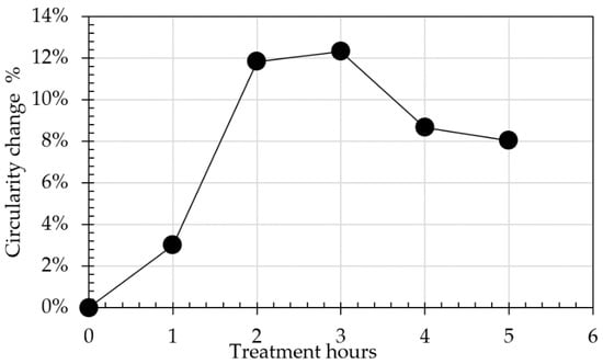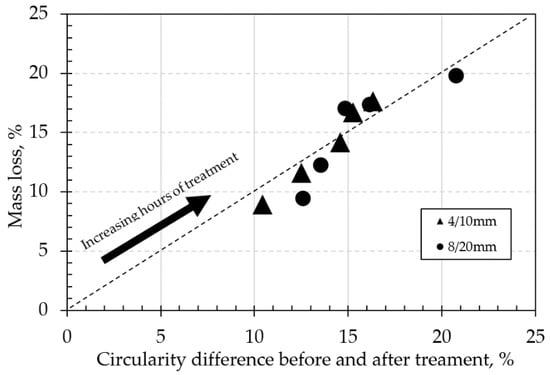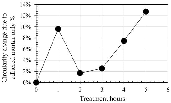 Changes is mass loss and circularity for 10 mm RCA subjected to small scale treatment for up to 5 h.