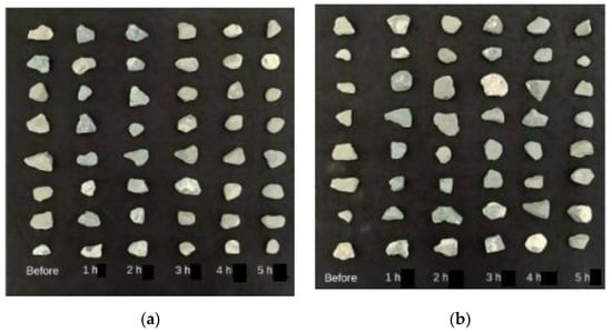 Visual changes in geometry of RCA: (a) 4/10 mm; (b) 8/20 mm subjected to mechanical treatment for up to 5 h.