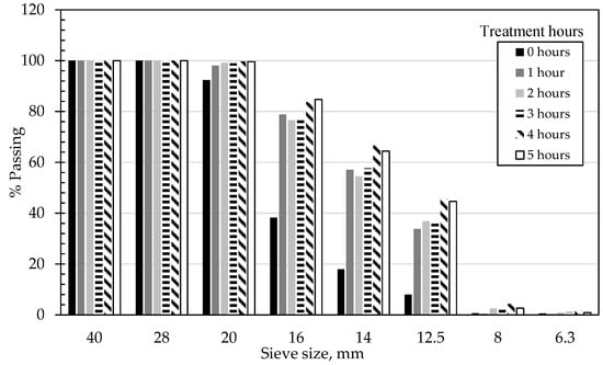 Effect of treatment hours on the particle size distribution of 8/20 mm NA.