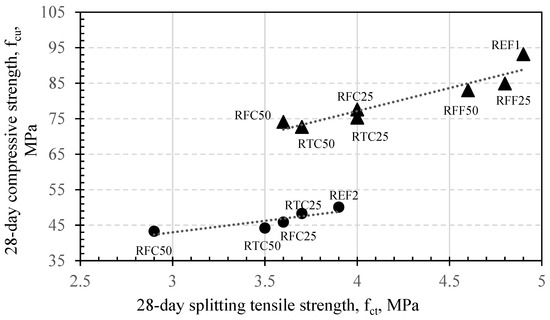 Table 5 and Figure 7 show the results of the compressive and splitting tensile strength development, for all mixtures at 7 and 28 days. Compressive strength is an indicator of the evolution of the microstructural density, mainly of the cement paste, whereas split tensile strength provides an indirect measure of the bonding adherence between the cement matrix and the aggregate. All concrete mixes exhibited an increase in compressive strengths from 7 days to 28 days, apart from the case of RTC50 (0.25), whose 7 and 28 day values were identical. The highest 28 day fcu value was observed in REF1 and the highest early strengths were exhibited by RFF25 (0.25), RTC25 (0.25), and RTC50 (0.25), reaching up to 96% of their 28 day strength values at 7 days. For low w/c ratios, higher replacement contents of coarse recycled aggregates, either treated or untreated, reduced both compressive and splitting tensile strengths at 28 days, although the compressive to splitting tensile strength ratio for each of those combinations appeared to be maintained relatively constant. This is apparent in Figure 7 when observing the slopes of the trend lines, which were depicted within a good linear regression. When incorporating, however, recycled fine aggregates in low w/c ratio concretes in either low or high amounts, there seemed to be a reduction in compressive strengths; this may be possibly attributed to the existence of unhydrated amounts of cement clinker within the microstructure of the concretes, due to the high cement contents. Splitting tensile values of these combinations were, however, relatively similar to those of the REF.