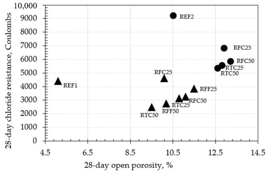 Relationship between open porosity and chloride resistance of concretes at 28 days (▲ = w/c ratio 0.25; ● = w/c ratio 0.5).
