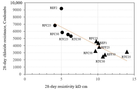 Relationship between rapid chloride resistance and resistivity of concretes at 28 days (▲ = w/c ratio 0.25; ● = w/c ratio 0.5).