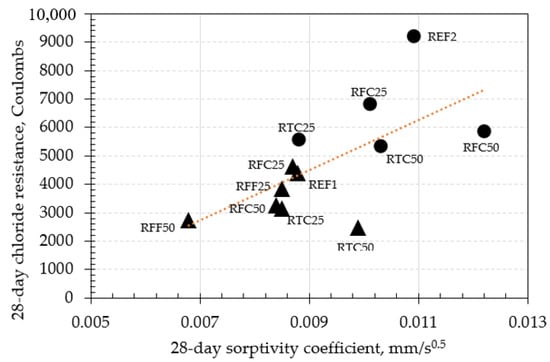 The relationship between the chloride resistance and capillary water absorption coefficient of mixes at 28 days, is shown in Figure 10. Both of these properties are permeation-based, and they directly relate to the degree of interconnectivity of the capillary pore network of concrete. The results showed that the mechanical treatment contributed to the reduction of permeability of concretes when comparing equivalent replacement contents (i.e., treated and untreated RCA) and at both w/c ratios investigated. It was observed that, in concrete mixtures of low w/c ratio, the incorporation of either treated, untreated, fine, or coarse RCA, specifically at 25% by mass, did not affect the sorptivity coefficients. Such behavior was apparent regardless of the corresponding chloride resistance for each mix. In particular, all RFC25, RFF25, and RTC25 mixes had almost identical sorptivity coefficients, while RTC25 exhibited the highest chloride resistance between these.