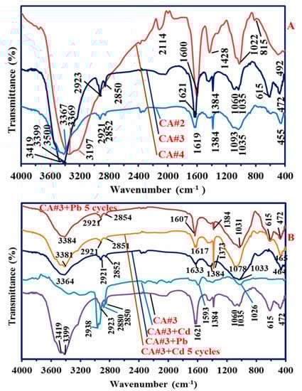 FTIR spectra of CA#2, CA#3 and CA#4 (A) and CA#3, after loading with Cd and Pb, and after five cycles of sorption desorption (B) (wavenumber: 4000–400 (cm−1)).