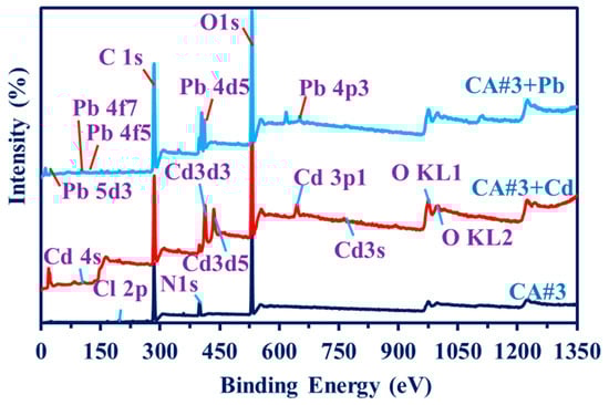XPS analysis was used to confirm (i) the chemical modifications of the synthesized material and (ii) investigate the type of bonding for the loaded sorbent through changes in the chemical environment of atoms after metal sorption (i.e., Cd(II) and Pb(II)). The results of deconvoluting of the main peaks and shifts after sorption were summarized in Table S5a,b (see Supplementary Materials). Figure 2 shows the XPS survey spectra of CA#3 (the most effective sorbent), and after loading with Cd and Pb metal ions. The prepared hydrogel was characterized by C 1s, O, (1s, 2s, OKL1 and OKL2 (weak)), N 1s, and Ca 2p. The loaded sorbent is characterized by the disappearance of Ca 2p, which confirms use in the ion exchange process with Cd2+ and Pb2+ from the solution. Cd2+ ion was confirmed by Cd (4s, 3d3, 3d5, 3p1 and 3s), while Pb found in the loaded sorbent as Pb (3d3, 3d5, 4f7, 4f5, and 4p3). Other ions are appeared in the loaded sorbent as Cl 2p either from medium (chloride medium) or metal-binding chloride species; which indicated that used in the sorption process. The high-resolution spectra (HRES) of some selected bands (as well as their deconvolution) with the assignment of the FWHM and BE were reported in Table S5a,b (see Supplementary Materials).