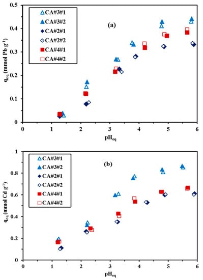 pH effect on Pb(II) (a) and Cd(II) (b) sorption using CA#2, CA#3 and CA#4 (C0: 0.958 mmol Cd L−1 for 1st Series and 0.967 mmol Cd L−1 for 2nd Series; C0: 0.48 mmol Pb L−1 for1st Series and 0.51 mmol Pb L−1 for 2nd Series; sorbent dosage, SD: 1 g L−1; temperature, T: 23 (±3) °C; time: 48 h; agitation speed: 170 (±3) rpm).