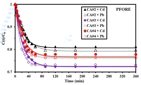 Sorption kinetics profile of the pseudo-first (PFORE) for Cd (dark symbols/solid lines) and Pb (dark symbols/dotted lines) (C0: 100 (±5) mg L−1; SD: 250 mg L−1, pH0: 5).