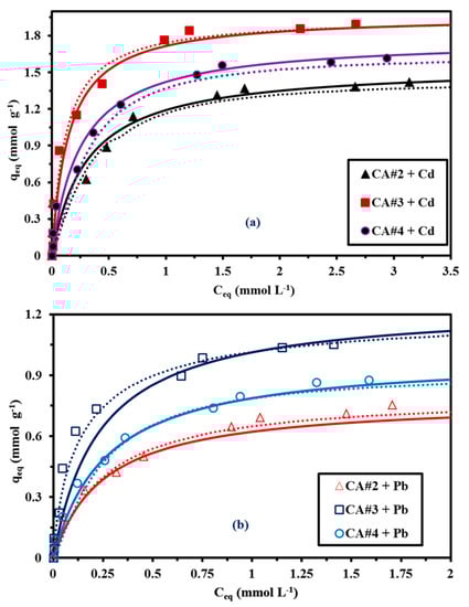 Sorption isotherms using CA sorbents (a) CA#2 + Cd, CA#3 + Cd, and CA#4 + Cd; and (b) CA#2 + Pb, CA#3 + Pb, and CA#4 + Pb—Modeling with Langmuir (solid lines), and Sips (dotted lines) equations (C0: 10–500 mg M L−1; SD: 1 g L−1; T: 23 (±3) °C; time: 48 h; agitation speed: 170 (±3) rpm).