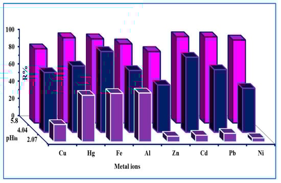Some concentrations are still higher than the allowance for drinking water. Zinc(II) has a high concentration in the MCL (5 mg L−1) and a lower concentration in the effluent (1.31 mg Zn L−1). The high level for the livestock feeds is 0.05 mg Cd L−1, and 0.1 mg Pb L−1, and 24 mg Zn L−1. Figure S12 (see Supplementary Materials) shows the selectivity coefficient of Cd and Pb comparing to the other elements at the selected pH values. It was shown that as pH increased, the loading capacity toward metal ions increased, showing the main improvements achieved with Cd and Pb. The SCCd/metal at pH 5.8 reached 3.04, 8.07, 30.11, 5.58, 38.18, 17.23, 8471.51, and 1.41 times for Hg, Ni, Cu, Fe, Zn, Al, Na, and Pb respectively, while the SCPb/metal at the same condition of pH value is about 5.74, 21.39, 3.96, 12.24, 6018.4, and 27.12 times respectively while reached around 0.71 for Cd. At the neutral pH, the selected experimental conditions are suitable for the livestock feed. In all cases, the final concentration can systematically be improved by increasing the SD. Data represented in Figure 6 show comparable studies of the removal efficiencies after treatment of water samples at different pH values. The maximum removal of metal ions was obtained at high pH values of 5.8. The R% for the metal ions at pH 5.8 is about 85.48, 98.31, 96.95, 91.14, 82.27, 99.44, 99.21, and 95.64% for Cu, Hg, Fe, Al, Zn, Cd, Pb, and Ni respectively, and these ratios decreased with decreasing the pH value to 69.08, 76.63, 93.38, 71.46, 54.67, 86.73, 72.41, and 50.92% respectively for pHin equivalent to 4. The poor recovery was obtained for the acidic pH value that reached 20.04, 53.74, 55.87, 56.44, 6.49, 7.65, 9.85, and 4.54% respectively, in which Hg, Fe, and Al show the highest R% (around 55%) over the others (less than 10% except for Cu around 20%).