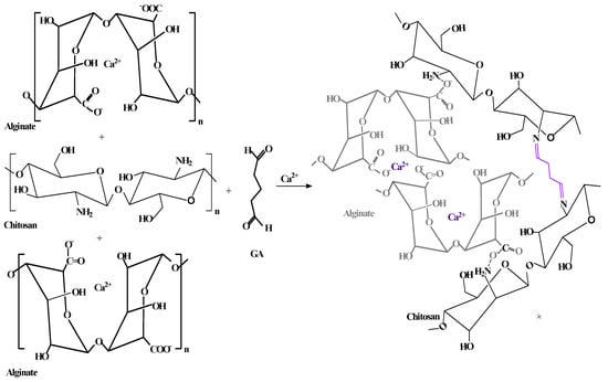 Synthetic route of the prepared hydrogel composite (the introduced color is referred to as the crosslinking of glutaraldehyde (GA) with chitosan and the ionotropic gelation of Ca2+ on alginate moieties).