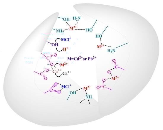 We summarize the data mentioned in the XPS survey, FTIR analysis, the effect of sorption as a function of pH, the pHPZC, and the semi-quantitative EDX analyses. We expected different interaction modes of the reactive groups present on the designed hydrogel and the metal ions in the solution. The material consists of multi-functional groups as amines (1°, 2°, and 3° amines) from chitosan moiety, hydroxyl groups from the polysaccharide of chitosan and alginate, and carboxylic groups from alginate. These groups are symmetrically arranged for binding with the metal ions. The functional groups in the sorbent are completely deprotonated (see the pHpzc analysis). Participating are the amines and hydroxyls (decreasing the intensities of OH and NH in the FTIR), tautomerization of C=O with the neighboring groups for bending (decreasing and shifts of the assigned peak in the FTIR and XPS analyses), also chelation with carboxylic groups as well as ionic exchange mechanism with the Ca2+ ions from the ionotropic gelation (disappearing of Ca2+ ions from the loaded sorbent in the XPS analysis, and also shifts of the C=O and COO− of the carboxylate salts in the FTIR analysis). The metal ions are found in the form of free metal cations (M2+) or as monovalent chloride form (as assigned from the XPS analysis), as summarized in Scheme 2.