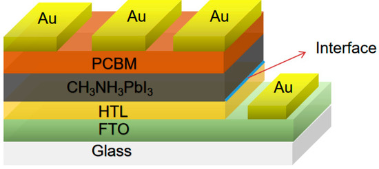 The device was designed with inverted structure by using sing wxAMPS. The temperature of the simulation was 300 K. The conventional parameters are listed in Table 1, as described in the results and discussion. The functional settings were as follows: defect type was neutral and the center of bandgap (Eg) was selected as defect energy level. The original defect densities of HTL and perovskite layer were 1013 cm−3 and 1014 cm−3, respectively. Gaussian energetic distribution was selected, and its characteristic energy was 0.1 eV. The original capture cross-section of function layers were 10−14 cm2. The work function of bottom and left electrode are 5.1 eV (Au) and 4.4 eV (FTO), respectively. The condition of AM1.5 illumination was applied to all simulations. A thin film (10 nm) was inserted between HTL and perovskite layer and its parameters were selected from the light absorption layer. Figure 1 shows the constitution of the PSCs. The electron transport layer we use in the simulation is [6,6]-phenyl-C61-butyric acid methyl ester (PCBM).