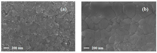 Scanning electron microscope (SEM) top-view of perovskite layers: (a) the sample of fluorine-doped SnO2/polyethylene dioxythiophene:poly (styrene sulfonate) (FTO/PEDOT:PSS/MAPbI3); (b) the sample of FTO/NiOx/MAPbI3.