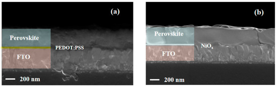 PEDOT:PSS and NiOx were adopted as organic and inorganic HTLs for inverted PSCs, respectively. Since the position of the valence band of NiOx is closer to that of CH3NH3PbI3 (MAPbI3), the open-circuit voltage (Voc) of the PSCs with NiOx as the HTL is higher than PEDOT:PSS [39]. The deposition of perovskite films on different organic substrates was studied in previous reports [21]. It was observed that different bottom substrates would had an influence on the growth of perovskite crystals.