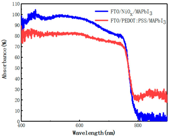 To research the impact of perovskite growth on different HTLs, the UV–vis absorption of light-absorption layers grown on two kinds of substrates (PEDOT:PSS and NiOx) are compared (Figure 4). Although there is no change in the composition of the perovskite, the enhancement of light absorption of the perovskite film deposited on NiOx layer can be seen in the wavelength ranging from 400 nm to 760 nm, which is due to improved surface morphology of perovskite film and higher optical transmittance of the NiOx layer.