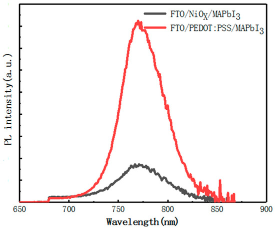 The photoluminescence spectra of ITO/HTLs/perovskite structure are obtained, as shown in Figure 5. Both of the photoluminescence emission peaks are located at about 765 nm. However, the emission peaks of perovskite layers grown on organic HTL (PEDOT:PSS) was significantly increased, which was attributed to the weak hole transport capacity of PEDOT: PSS compared with that of NiOx. When the holes are transported away, the recombination of carriers is reduced, resulting in a decrease in photoluminescence intensity. Generally speaking, the lower the photoluminescence intensity, the better the device performance.