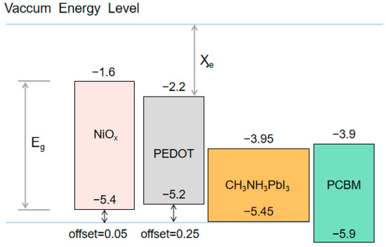 The physical parameters of different functional layers are provided in Table 1. Eg represents the band gap of different materials; Ӽe is the electron affinity; εr is the dielectric constant; μn and μp are the electron and hole mobility of the functional layer, respectively; NA and ND are the acceptor and donor impurity concentration; NC and NV are the effective density of states (DOS) of the valence band and conduction band, respectively; Value band offset is defined as the difference between the maximum value band (MVB) of the light absorbing layer and the hole transport layer. Energy diagrams of the constituting layers with different HTL materials are shown in Figure 6. These parameters are adopted from references [1,2,3,4,5,6,7,8].