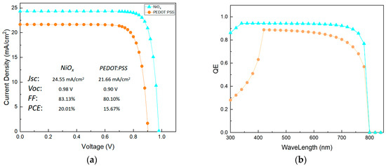 The quantum efficiency (QE) of devices with different HTLs is shown in Figure 7b. We can observe that the quantum efficiency of the device with NiOx as the HTL rises rapidly to 0.95, in the wavelength range of 300–340 nm, reaching the maximum. The difference in quantum efficiency in the front stage is caused by the difference in optical transmittance of the hole transport layer, which is reflected in the optical absorption coefficient and film thickness of the HTL. The device with NiOx as the HTL maintains a s quantum efficiency in the wavelength range of 340–750 nm, maintaining above 90%. However, the quantum efficiency of the device with PEDOT as the HTL shows significant decline within the same range, and the value is lower than that of the NiOx device. This is due to the poor morphology, and film thickness of the perovskite grown on different HTL materials. The difference is reflected in the setting of the optical absorption coefficient of the perovskite layers of different devices (refer to the absorption spectra). In addition, the decrease of quantum efficiency may be due to the lower electron and hole mobility of the PEDOT:PSS layer, which affects the collection of charge.