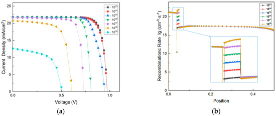 Due to the increase of the non-radiative recombination at the interface, the deep trap energy levels generated by several point defects result in the decrease of the device performance. The recombination rate of devices with different interface defect density is shown in Figure 8b. We can find that as the defect density increases, the recombination rate of the device enhances significantly at the position of 40–50 nm, which corresponds to the interlayer with a thickness of 10 nm. The point defects of deteriorated interface cause the generation of deep trap energy levels, which leads to the trap-assisted non-radiative recombination. The defect density magnitude was set in the simulation software varies from 1014 cm−3 to 1019 cm−3, which greatly affects the charge transport and recombination rate of devices. When the defect density is high, the decrease in Jsc and a significant voltage loss can be observed. Therefore, the increase in defect density generates a negative influence on device performance.