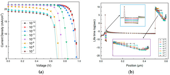 The degradation of device performance may be due to the enhancement of the recombination rate and reduction in carrier lifetime caused by the high capture cross-section at the interface. To account for the phenomenon, the interface layer is considered with capture cross-section varying from 10−14 cm2 to 10−7 cm2. As shown in Figure 9b, the reduction of the hole lifetime is observed in the range of 40–50 nm, corresponding to the position of the interface layer. Lifetime and recombination will affect the carrier diffusion length, which has a marked affect on the device performance. It is worth noting that the enhanced capture cross-section of the interlayer affects the carrier lifetime of electron transport layer.