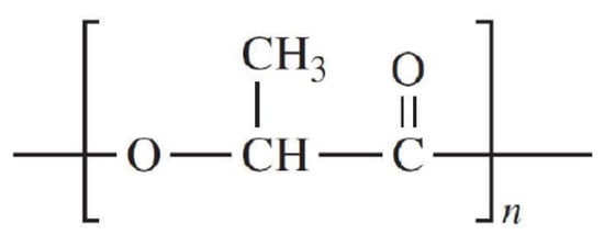 PLA filament was purchased from a commonly known online source (3DXTECH, Grand Rapids, MI, USA). PLA is a biodegradable “bioplastic” that is insoluble with water and is made from plant-based materials [29]. The chemical composition structure of PLA can be seen in Figure 1 [30]. Generally, PLA is obtained from tapioca root, cornstarch, and sugar cane and is widely recognized as an eco-friendly biodegradable 3D printing material. PLA commences to melt and soften at around 50 °C. Hence, a relatively lower temperature (180–190 °C) of the extruder nozzle is required to obtain a printable form of PLA [31,32].
