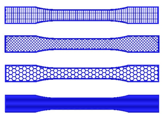 Filament feeding is the very first step in the printing procedure. This work was done by warming up the extruder and gradually supplying the filament. Then, Repetier-Host’s manual commands (Repetier Host 1.6.2, Hot-World GmbH & Co, Willich, Germany) were used for the extrusion of filament to make a certain smooth flowing and feeding. Then, by using the Repetier-Host interface, the print command was given. Three specimens for each geometrical infill shape (solid, rectangular, diamond, and hexagonal infill patterns presented in Figure 3) were printed for characterization. The infill design had connected each other through the same filament fibrils. Figure 4 shows an image of the printing of the rectangular shape infilled specimen. Universal (MTS) Test Works 4 software [33] was used in this study to record the load vs. elongation data, which were further processed to obtain stress vs. strain graphs. The printing parameters are printing temperature, (extruder nozzle temperature) is equal to 215 °C and layer thickness is 0.3 mm. The amounts of filament needed in linear millimeters are 1371, 1435, 1621, and 5016 mm for rectangular, diamond, honeycomb, and solid configuration, respectively. On the other hand, the estimated printing times are 9.54, 10.01, 11.12, and 27.58 min for rectangular, diamond, honeycomb, and solid configuration, respectively.