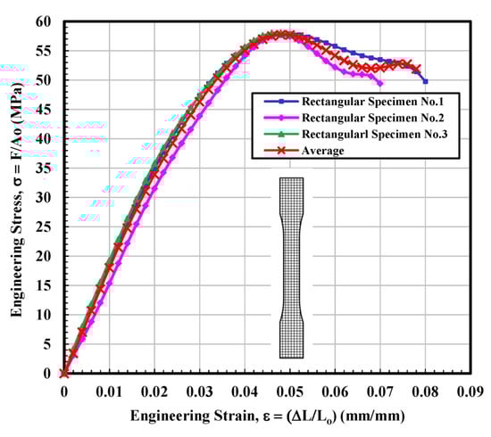 Figure 6 observes the stress–strain curves for the rectangular tested specimen. The stress–strain lines of 3D printed parts with a rectangular shape displayed behavior closely resembling a ductile material. It seems very interesting as the filament (PLA plastic filament) used for all types of infill configurations, i.e., solid, rectangular, diamond, and hexagonal was the same. The main difference between solid and rectangular infills was the effective “loss” in the cross-sectional area. The difference in the stress vs. strain behavior suggests that the geometry of the 3D printed specimen significantly affects the mechanical properties. From Figure 6, nearly identical data were observed for the specimen 1 and 3 up to the ultimate tensile stress point. Soon after, the test sample 3 failed, while test sample 1 was able to withstand much longer. On the contrary, test sample 2 displayed slightly inconsistent behavior with a somewhat fluctuating (less smooth) curve. The wavering behavior of this sample may be attributed to the slight movement of the fibers or may be related to the simple resistance to the load in a different manner. The average calculated values of modulus of elasticity and ultimate tensile stress (UTS) were 1759.4 MPa and 57.74 MPa, respectively, which is higher than the average calculated values of solid infill tested specimen. The calculations of the fitting curve for the average results are selected according to polynomial regression (degree = 8) and correlation coefficient, r within 0.996 to 0.999. The maximum yield strength (44.97 MPa) is determined according to standard ASTM D638-14 [28], as shown in Table 2.