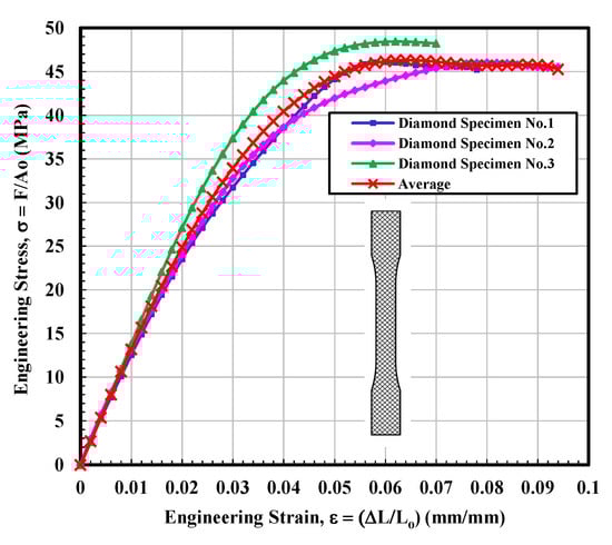 Stress–strain curves for the diamond infilled samples are presented in Figure 7. A typical stress–strain diagram was seen for the diamond-infilled samples. It is observed that the obtained results for the three tested samples were somewhat inconsistent for different samples, and therefore, unique features were seen for each tested specimen. The stress vs. strain relationship observed for sample 1 exhibited very interesting phenomena around the point 0.025 mm/mm recorded strain, and a sudden drop in the measured stress was found. It is suggested that this sharp dip could result from the failure of fibers within the structures. This phenomenon is important for the mechanical performance of this specimen. It suggests that regardless of some structural damage (failure of fibers) around the point 0.025 mm/mm recorded strain, the sample still became able to reach a UTS value that is roughly comparable to the other samples’ UTS values. Tested sample 3 results were relatively normal as a function of applied stress until the maximum stress value, and then showed the almost constant value of stress until fracture, as can be observed from Figure 7. The average calculated values of modulus of elasticity and ultimate tensile stress (UTS) were 1300 MPa and 46.32 MPa, respectively, which is higher than the average calculated values of solid infill tested specimen but lower than that of average calculated values for 3D parts printed with a rectangular configuration as demonstrated in Table 3. Furthermore, the fitting curve for average results is selected according to polynomial regression (degree = 8) and correlation coefficient, r within 0.996 to 0.999. The yield strength is determined according to standard ASTM D638-14 [28].