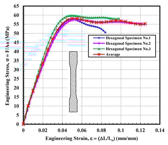 Engineering stress–strain curves for hexagonal infill test specimens.