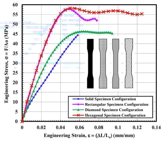 Average engineering stress–strain curves for solid, rectangular, diamond, and hexagonal infill test specimen configurations based on three tensile test specimens.