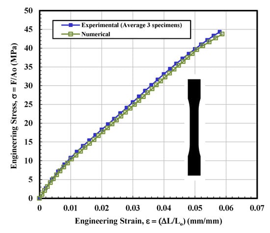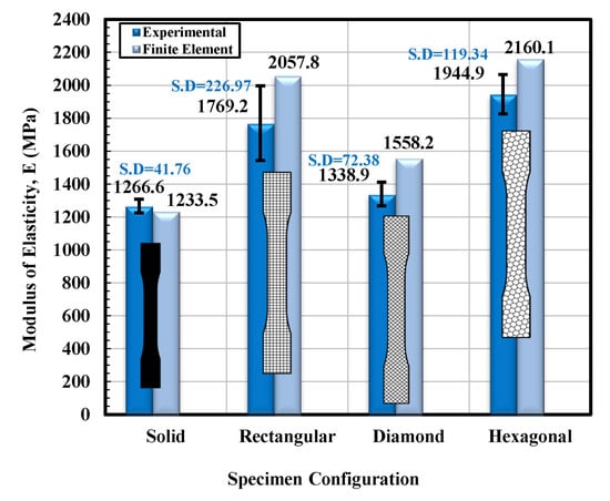 Based on the observations mentioned above, it is suggested that the behavior of solidly infilled specimen may be attributed to the relatively high infill density and good bonding adhesion between the printed layers that make the solidly infilled specimen structure stiffer and brittle, while rectangular, diamond, and hexagonal infill patterns showed ductile-like behavior, possibly due to relatively loose bonding between printed layers and fibril connections and structures. To further validate the obtained experimental results, an important software tool, finite element analysis, was applied, and experimental and simulated results were compared as shown in Figure 11, Figure 12, Figure 13 and Figure 14. These test results closely agreed with the experimental test results. Figure 15 show the stress distribution in the x-direction for solid, rectangular, diamond, and hexagonal infill test specimen configurations based on finite element analysis. Figure 16 represents the experimental and simulated outcomes of modulus of elasticity for various specimen configurations. It can be seen from Figure 16 that there is ~2–10% difference in experimental and simulated outcomes of both solid and hexagonal infill test specimens.
