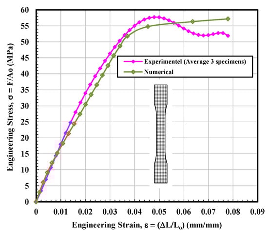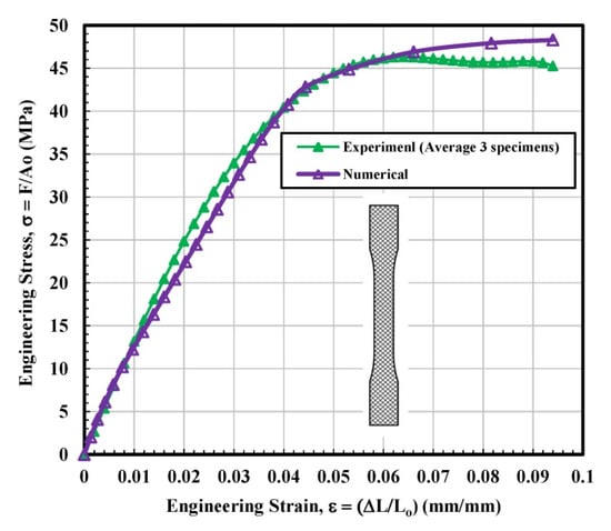 Engineering stress–strain curves for rectangular tested specimen based on experimental and finite element analysis.