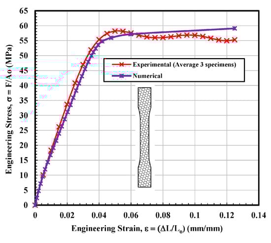 Engineering stress–strain curves for hexagonal tested specimen based on experimental and finite element analysis.