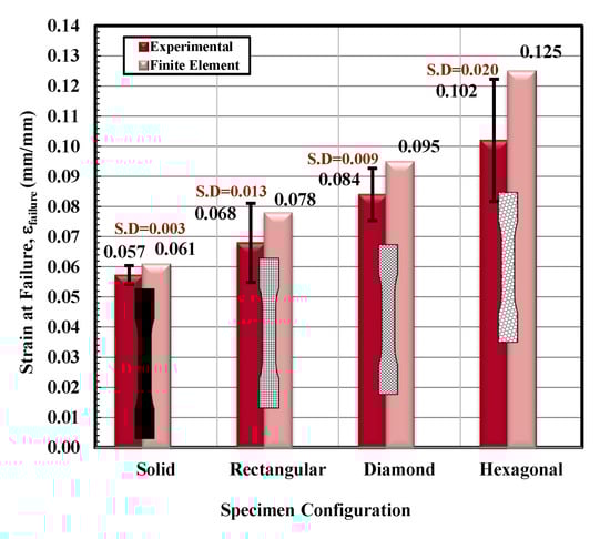 Strain at failure versus specimen configuration for both experimental and finite element analysis.