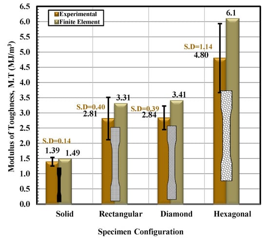 On the other hand, approximately ~14% difference in experimental and simulated results were found for the rectangular and diamond infill test specimen. The experimentally recorded and simulated yield strength results are shown in Figure 17 for solid, rectangular, diamond, and hexagonal infill configurations. In terms of yield strength, the difference between all recorded and simulated results was found to be less than ~2%. Similarly, there was a minute difference in finite element analysis and experimental results in terms of strain at failure (Figure 18), strength at failure (Figure 19), and modulus of toughness (Figure 20) for all specimen configurations. Based on the observations of finite element analysis and experimental results, it can be suggested that the attained outcomes from the tensile testing were accurate regardless of minor standard deviations.