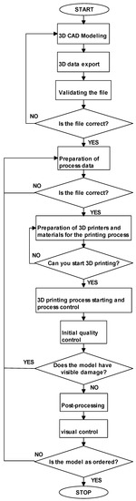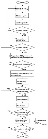 For manufacturing models that are directly connected to the manufacturing process, visual control is the first stage of verifying quality compliance after manufacturing a physical artifact, and the result determines further courses of action. If damage to the model is visible to the ‘naked eye’, then it is usually treated as a non-compliant product. Then, the discovered errors are analyzed, and the printing process has to be recommenced. If no such damage is apparent, then additional quality verification activities are conducted by means of measuring instruments, gauges, automated and manual scanners, tomography, or coordinate computing techniques. Therefore, the course of 3D print quality control may be highly tailored and differ between products.