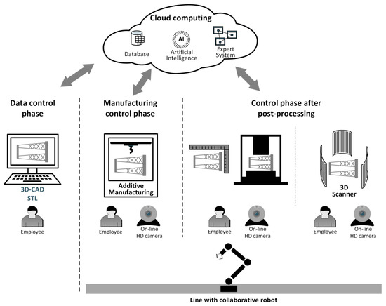 The proposed architecture of the comprehensive system for additive manufacturing control accounts for both direct control by qualified specialists and complete automation, as well as remote supervision, to meet the needs of Industry 4.0. Both forms of supervision can be applied simultaneously: one to meet in-house needs and the other in the case of supervision by a customer. In particular, remote supervision has enormous potential within the scope of dispersed production lines, which are typical in the context of the global economy [32,38,39]. Furthermore, the presented system architecture involves local repositories of product and component quality records, and it collects, synchronizes, and processes data in a computing cloud. Thus, the features of the proposed system meet the needs of Industry 4.0, as it combines and integrates individual design and manufacturing processes, available knowledge, and the experience and skills of a dispersed team of specialists. The fulfillment of these needs is aimed at supporting diverse production systems and increasing the availability and efficiency of these processes with the use of currently available computer network technologies, IT systems, and the automation and control of manufacturing processes. Therefore, this system meets the requirements of Industry 4.0 in all indicated areas. It enables the integration of remote resources of both individual elements and entire lines, the use of information compiled in knowledge bases, and the use of modern systems based on artificial intelligence. Moreover, it is adapted to exploit the potential for remote operation and consultation. Additionally, the proposed architecture has features of open systems, including scalability, customization, and interoperability between different systems and resources.