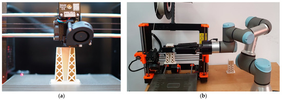 Figure 4a depicts a control process with the application of a camera. In Figure 4b, a collaborative robot working with a 3D printer (Prusa i3 MK3S) is presented.