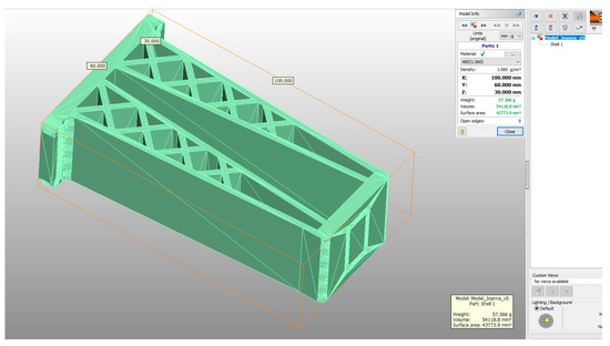 A 3D CAD model of a car mirror holder was applied in the analysis of print quality control. The authors’ intention was to ensure that the chosen element was universal enough to be used by companies in the automotive industry. When commencing the rapid prototyping process, the dimensions of the designed artifact should be controlled (verify if the model was not scaled). Similarly, it is very important to conduct an initial verification of the model after data processing; in this study, initial verification was performed with the 3D-Tool program (Figure 5).