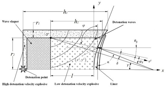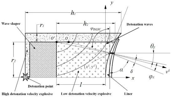 According to our previous researches [2,27], in a DLSC, detonation waves that propagate in the LE are no longer centered at the point and the center of the detonation waves becomes the point. The incident angle of detonation wave in the horizontal direction of shaped charge is ,