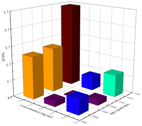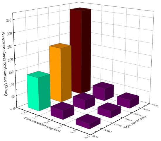 Table 2 lists the measured sheet resistance, average sheet resistance, and the NUF of the AgNW transparent electrode at different concentrations and spin speeds. Figure 2 and Figure 3 show, respectively, a 3D histogram of the variation in sheet resistance and NUF with concentration and spin speed.