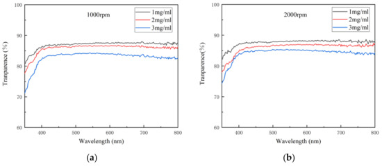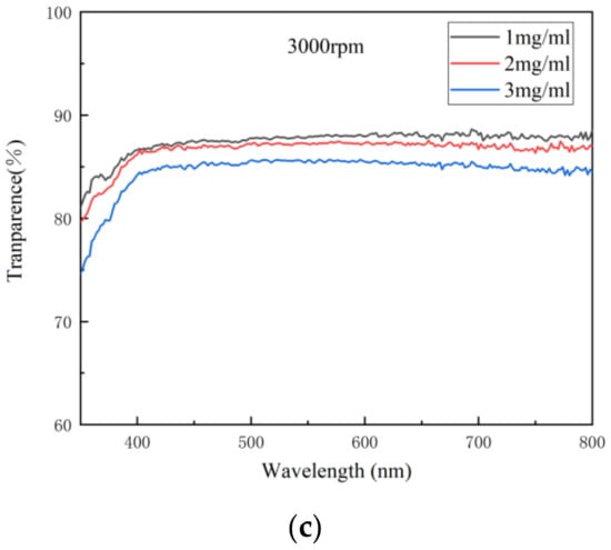 Transmittance is the percentage of the luminous flux passing through the medium and the incident luminous flux. As an important index of the optical properties of the transparent electrode, transmittance indicates the ability of light of different wavelengths to pass through the electrode. When the thickness of the electrode is less than the wavelength of the incident light, only a small amount of light can be absorbed by the electrode, so in general, the thinner the electrode is, the higher its transmittance will be. Figure 4 shows the variation in transmittance spectra with concentration at different spin speeds. It can be seen from Figure 4 that the transmittance of the electrode decreased with the concentration at each spin speed, indicating that with the increase in the density of AgNWs, the ability of light of each wavelength to pass through the electrode decreased gradually.