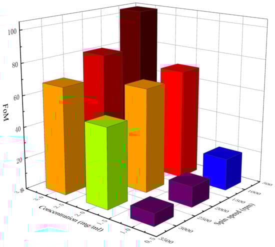 By substituting the sheet resistance (Rs) and the transmittance at 550 nm (T) into Equation (3), the FoM of each electrode can be calculated. Table 4 lists the calculated FoM of the AgNW transparent electrodes at different concentrations and spin speeds, and Figure 5 shows the 3D histogram of the variation in FoM with concentration and spin speed. According to Table 4 and Figure 5, the FoM of different electrodes varied greatly. When the concentration of AgNW solution was 1 mg/mL, the FoM of each electrode was all less than 35 at different spin speeds, indicating that this concentration was not suitable for the preparation of the AgNW transparent electrode with high comprehensive properties. When the concentrations of the AgNW solution were 2 and 3 mg/mL, the FoM of each electrode was all more than 35 at different spin speeds, indicating that for the AgNWs with a diameter of 40 nm and a length of 45 μm (aspect ratio: 1125), the concentration of the AgNW solution should reach at least 2 mg/mL to make an electrode with a relatively high comprehensive quality. Among all the prepared electrodes, when the concentration of the AgNW solution was 3 mg/mL and the spin speed was 1000 rpm, the FoM of the electrode was highest, reaching 104.42, showing great potential. The results showed that the FoM of the electrode generally decreased with the spin speed, indicating that the spin speed should not be too fast. As the concentration of the AgNW solution increased, the FoM of the electrode generally increased, indicating that when the concentration of the AgNW solution was low, with the increase in the concentration, the positive impact of the improvement of conductivity on the FoM was greater than the negative impact of the decrease in transmittance on the FoM. As the concentration continues to increase, there will theoretically be a threshold that makes the FoM reach its maximum value, which will not be studied further in this paper. In addition, the electrode prepared at 1000 rpm with a concentration of 2 mg/mL and that prepared at 3000 rpm with a concentration of 3 mg/mL were also similar in terms of the FoM, which were 69.92 and 67.84, respectively.