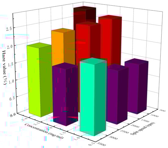Table 5 lists the calculated haze value of AgNW transparent electrodes at different concentrations and spin speeds. Figure 6 shows a 3D histogram of the variation in haze value with concentration and spin speed. It can be seen from Table 5 and Figure 6 that the clarity of each electrode was good and the haze value was generally low, with the lowest being 1.48% and the highest being 2.82%. When the concentration of the AgNW solution was 1 mg/mL, the haze value presented an increasing trend with the increase in spin speed, which might be related to the uniformity of the distribution of AgNWs on the substrate. As can be seen above, at a relatively low concentration, with the increase in spin speed, the uniformity of electrode gradually decreased, and then the rough surface of the electrode enhanced the scattering of light, which led to the increase in haze value. When the concentrations of the AgNW solution were 2 and 3 mg/mL, the haze value presented a decreasing trend with the increase in spin speed, which might be related to the density of AgNWs on the substrate. As can be seen above, at a relatively higher concentration, the distribution of AgNWs on the substrate was generally uniform. With the increase in spin speed, the density of AgNWs on the substrate and the thickness of the electrode gradually decreased; thus, the scattering effect of the AgNW network on light was weakened, which led to a decrease in haze value. In addition, the electrode prepared at 1000 rpm with a concentration of 2 mg/mL and that prepared at 3000 rpm with a concentration of 3 mg/mL were also similar in terms of the haze value, which were 2.65% and 2%, respectively. The results showed that although the concentration and the spin speed of these two electrodes were different during the preparation, their photoelectric properties were very similar; thus, they could be considered equivalent.