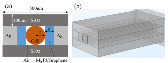 The surface plasmon (SP) waveguide generated at the metal–dielectric surface is coupled with the cylindrical high refractive index gain dielectric waveguide to form a hybrid mode. When combined with the principle of the traditional silicon-on-insulator (SOI) waveguide with its excellent optical properties, the structural model of the new hybrid plasmonic waveguide designed in this work is as shown in Figure 1a. The structure is composed of CdS gain medium nanowires, an upper SiO2 layer, a lower SiO2 layer, left and right medium layers and Ag layers, and an air gap area. Here, the dielectric layer thickness is d, and the radius of the CdS nanowires is r. Based on the actual value of the waveguide synthesized by the laboratory and the difficulty of the simulation, the length L is set at 10 μm. In this design, we first analyzed the structural characteristics of MgF2, which is a traditional material, and then introduced the new dielectric material (graphene) to compare the pattern characteristics obtained when using the two different materials.